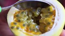 Die Maracuja ist eiförmig, hat eine feste Haut und viele essbare Kerne, ähnlich wie ein Granatapfel. Der Saft der Maracuja schmeckt je nach Sorte bitter süßlich